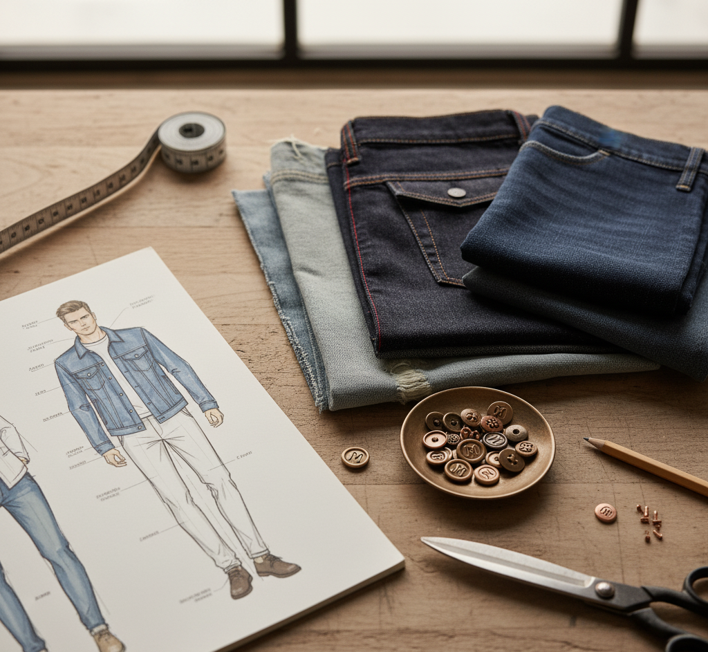 - Step 2: Fabric Sourcing: We help you select the perfect denim—selvedge, stretch, raw, sustainable cotton, etc.