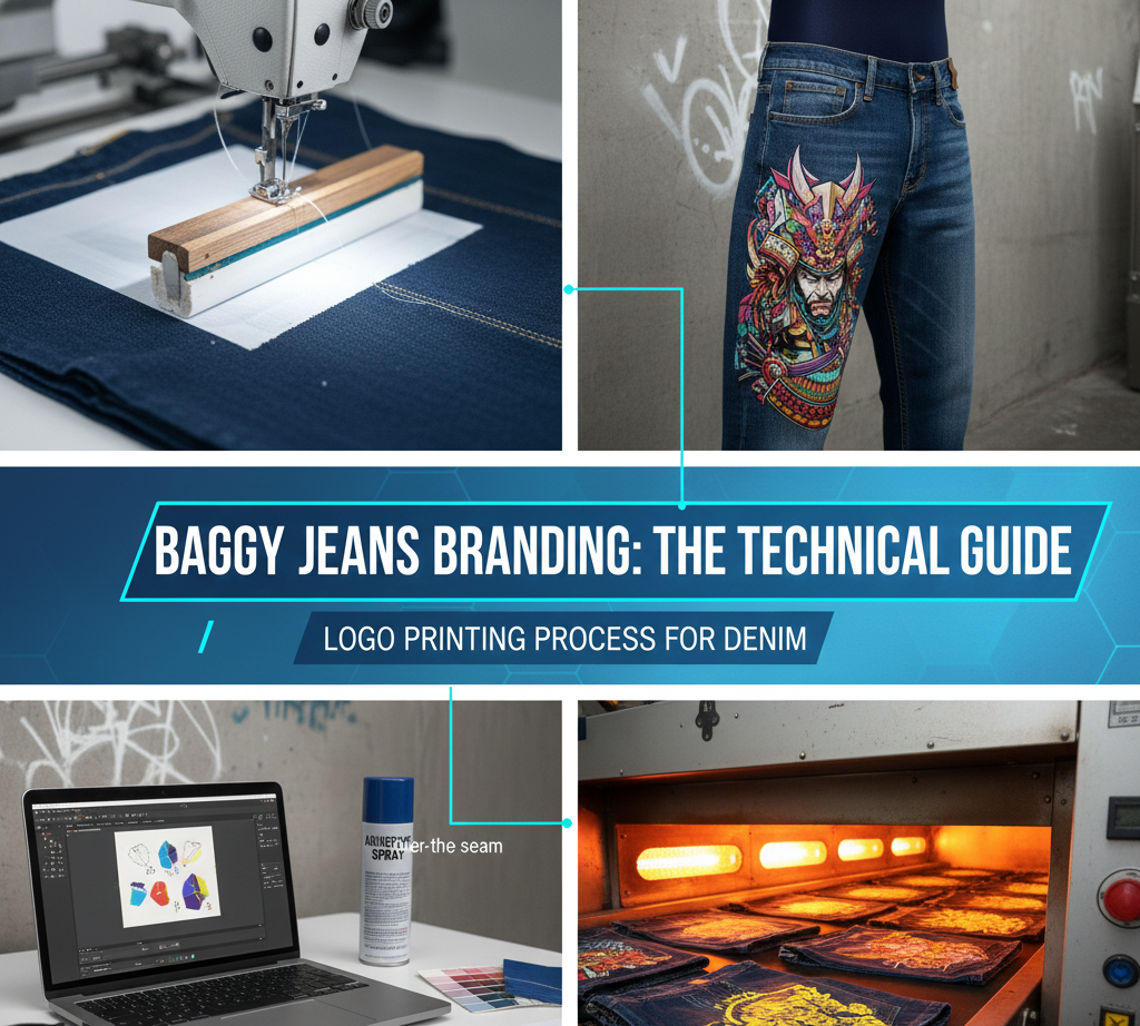 Here is the technical workflow for executing high-quality logo prints on baggy denim, from design file to the curing oven.