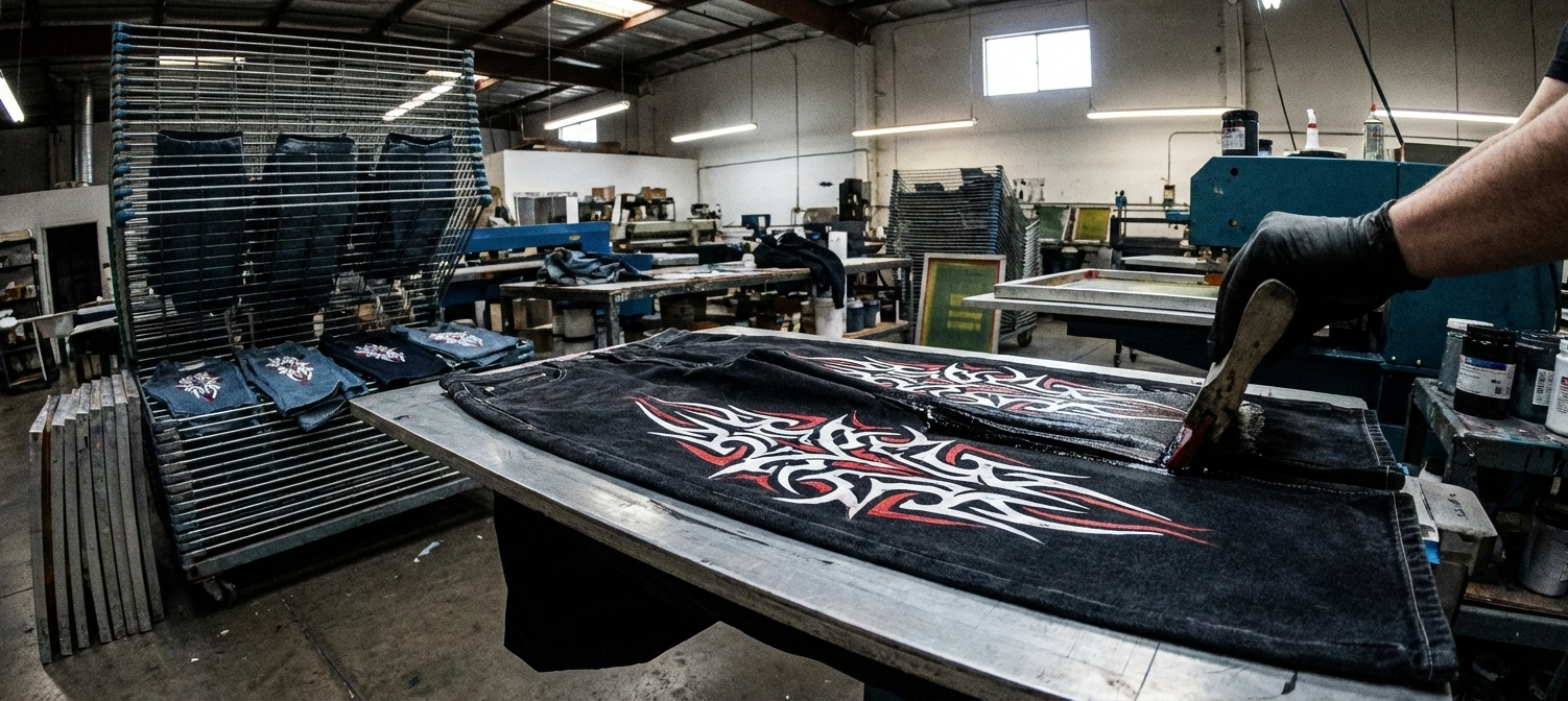 This is the industry standard for high-end brands (think Evisu, Supreme, Off-White). You print the fabric before it becomes a pair of pants.