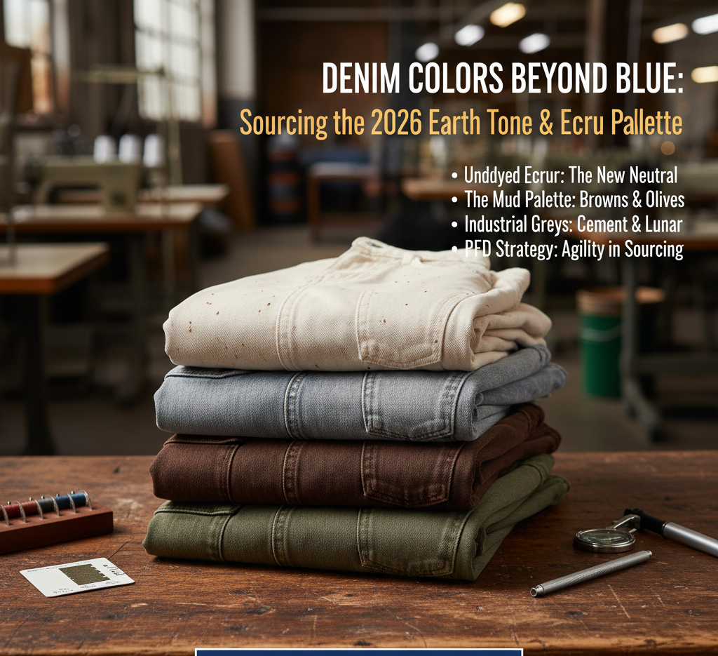 For 2026, the male consumer is looking for versatility. They want the durability of denim but the color palette of chinos. This report outlines the three dominant color families you must secure capacity for: Undyed (Ecru), The Mud Palette (Browns/Olives), and Industrial Greys.