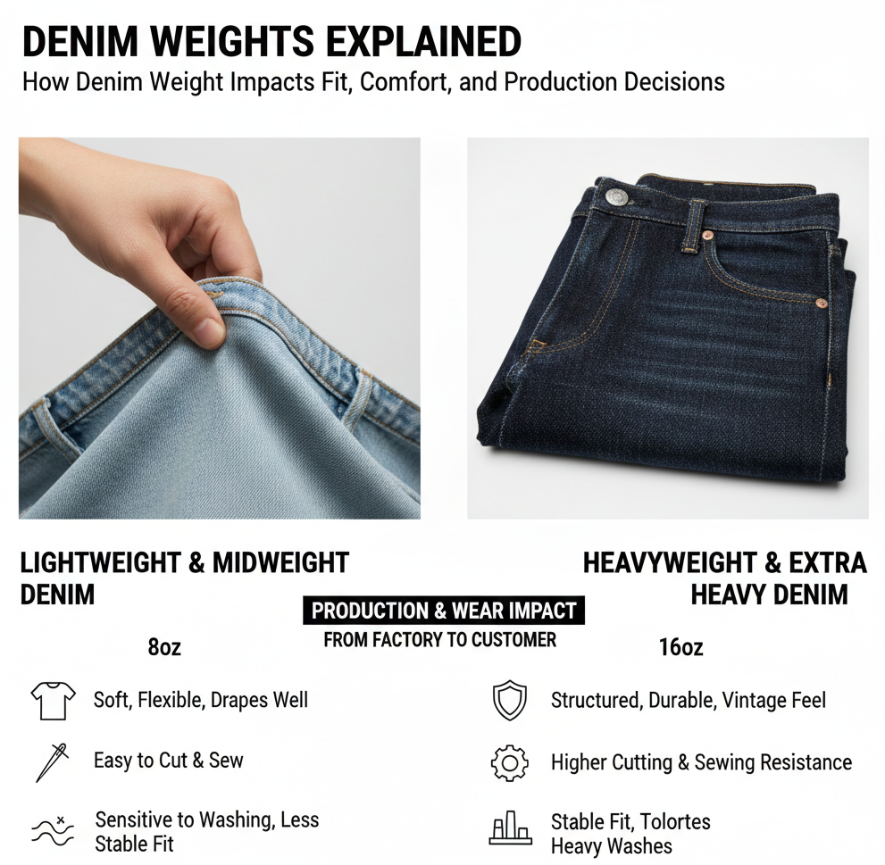 In real production, denim weight affects far more than how “thick” a fabric feels.