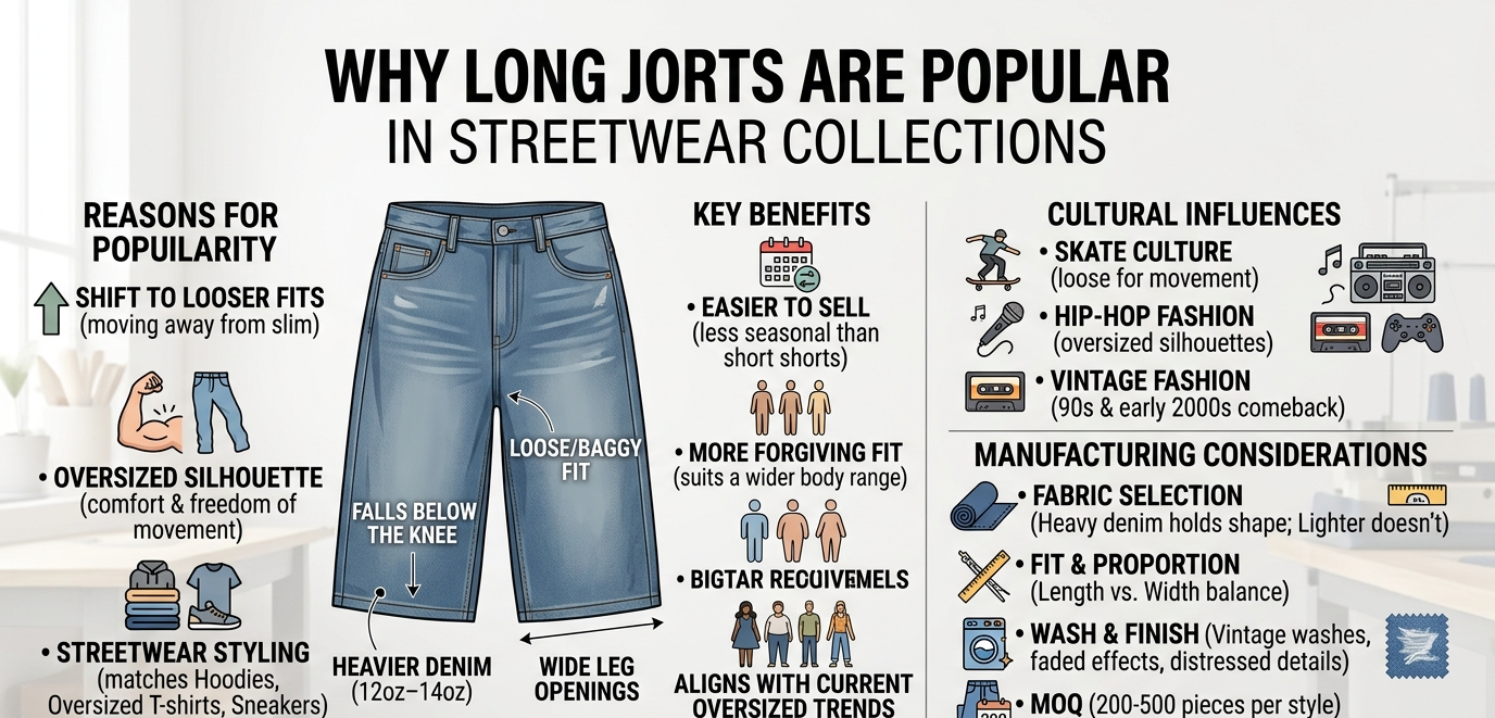 Long jorts are part of a broader shift toward oversized denim and relaxed silhouettes. For streetwear brands, they offer a combination of trend relevance, commercial stability, and flexible design options.