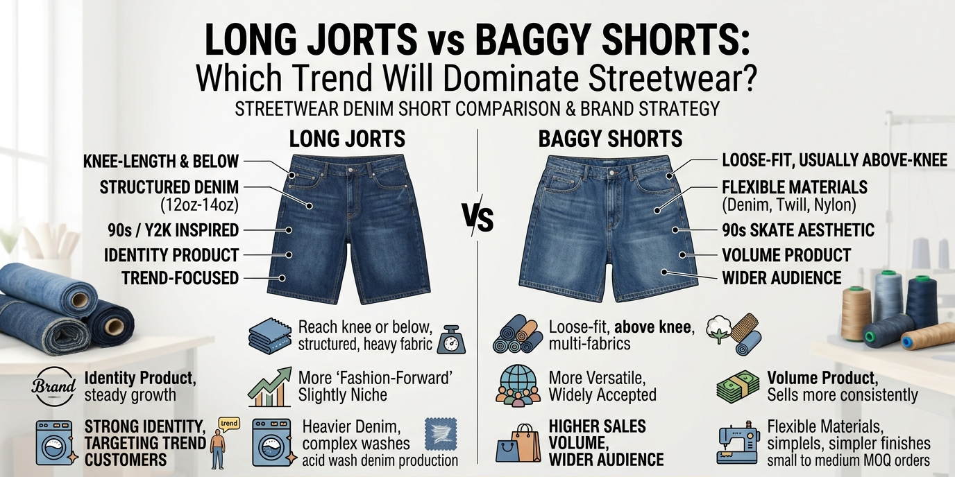 Long jorts and baggy shorts reflect the same shift toward oversized fashion, but they serve different roles in a collection. Baggy shorts offer broader commercial appeal, while long jorts help define a brand’s identity. For most streetwear brands, combining both styles is the most practical strategy.