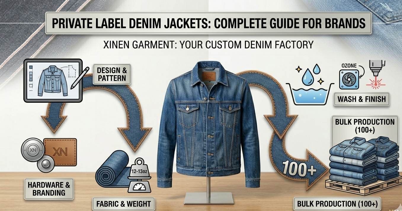 Traditionally, factories shy away from jacket orders because the assembly time is significantly longer than a standard five-pocket jean. However, our specialized custom manufacturing lines at Xinen Garment are optimized for Low MOQs. You can launch your private label jacket collection with just 100 pieces per style. You provide the Tech Pack (or a physical reference sample), and we handle the pattern grading, fabric sourcing, washing, and bulk production.