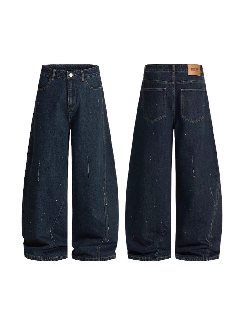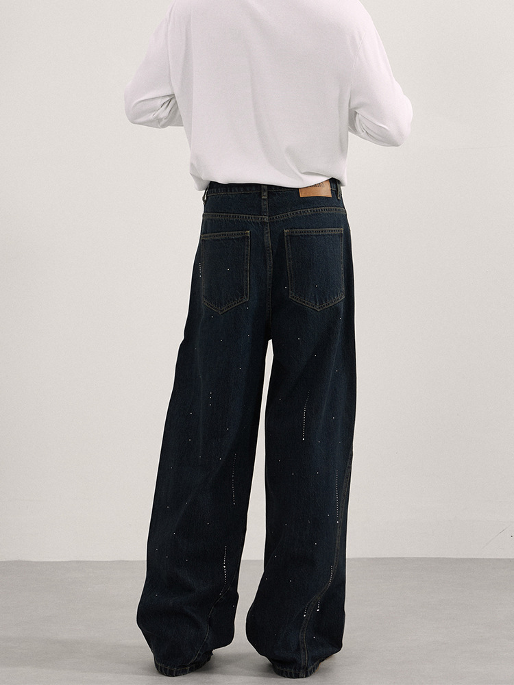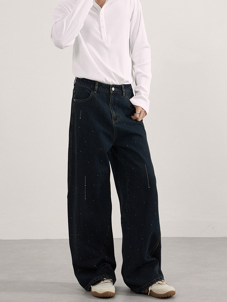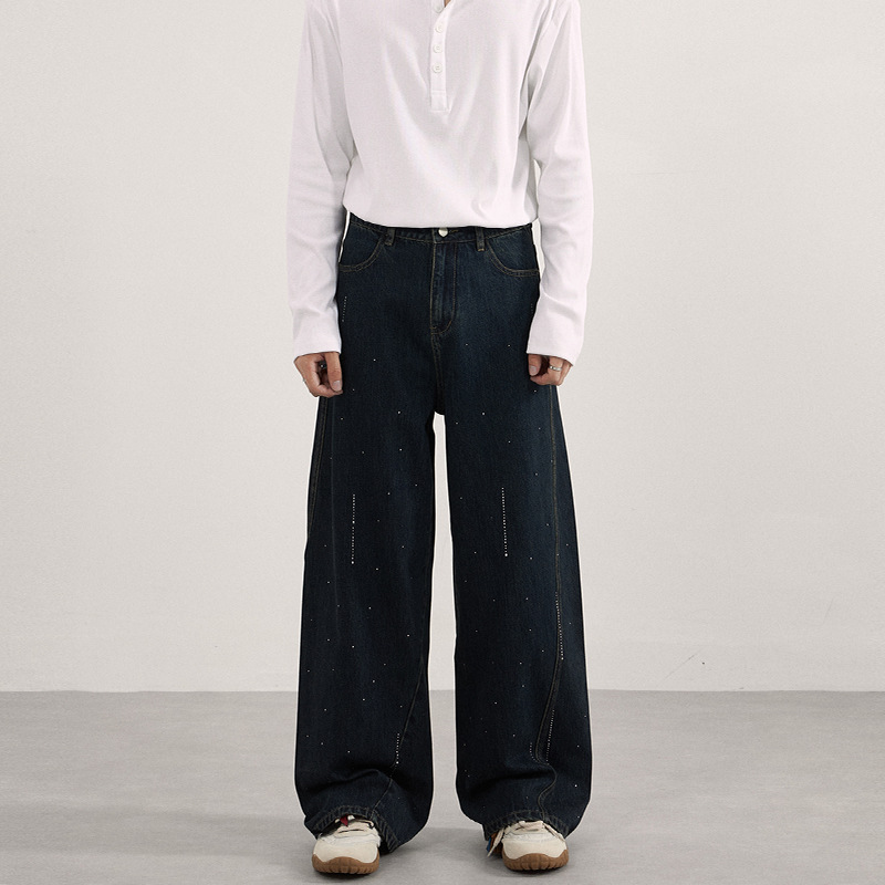 Introducing our exclusive Retro Patterned Loose Straight-Leg Jeans, a trending piece designed for brands aiming to capture the authentic American Vintage look with a modern twist. The unique Blue-Grey wash serves as the perfect canvas for the intricate Brick-Patterned / Raindrop Design – a key feature that separates this denim from standard wash treatments.