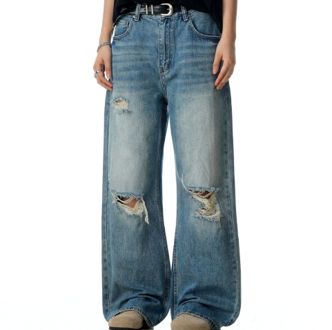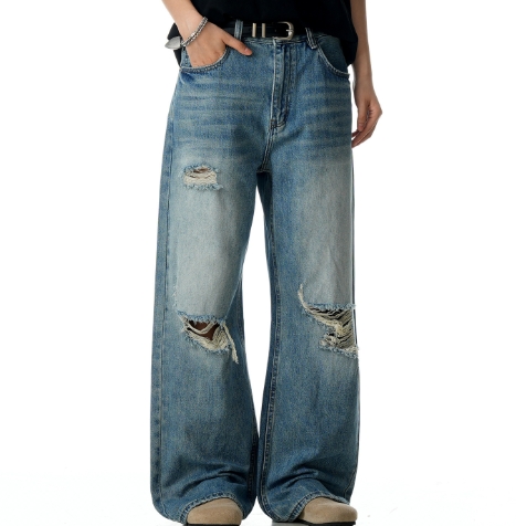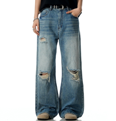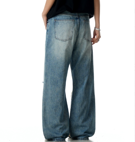 Product Name | Custom Retro Ripped Jeans | Wholesale Stacked Hem Denim |
