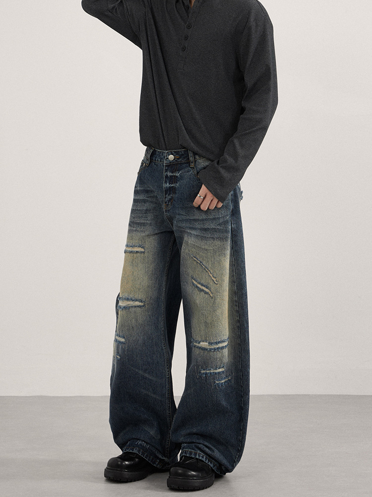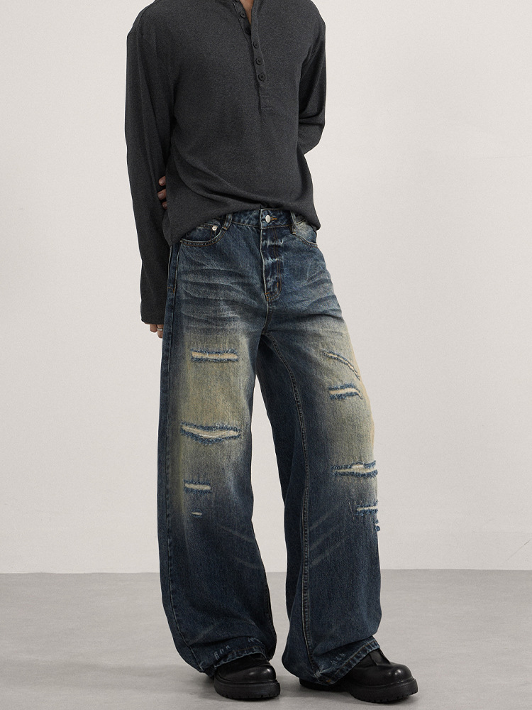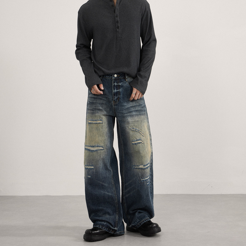 | Product Name | OEM Heavyweight Distressed Denim Manufacturer: Patched & Ripped Wide-Leg Jeans |
