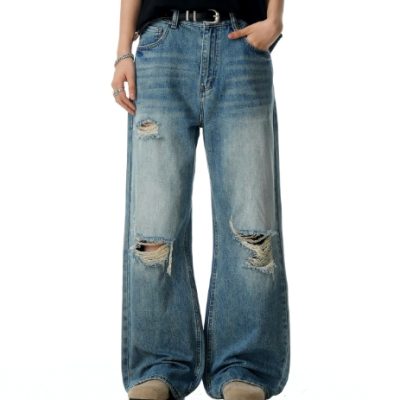 Custom Retro Ripped Jeans | Wholesale Stacked Hem Denim