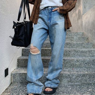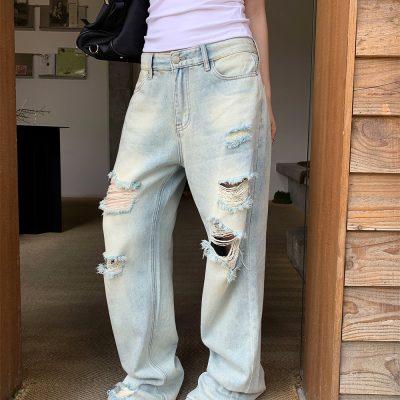 Women’s High Street Distressed Ripped Straight Jeans – Retro Casual Denim Pants