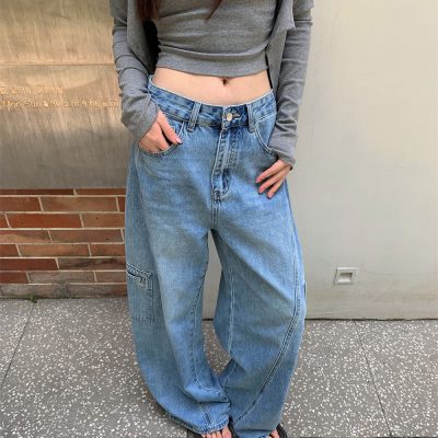 Women’s Baggy Fit Wide-Leg Jeans with Side Drawstrings and Unique Pocket Design