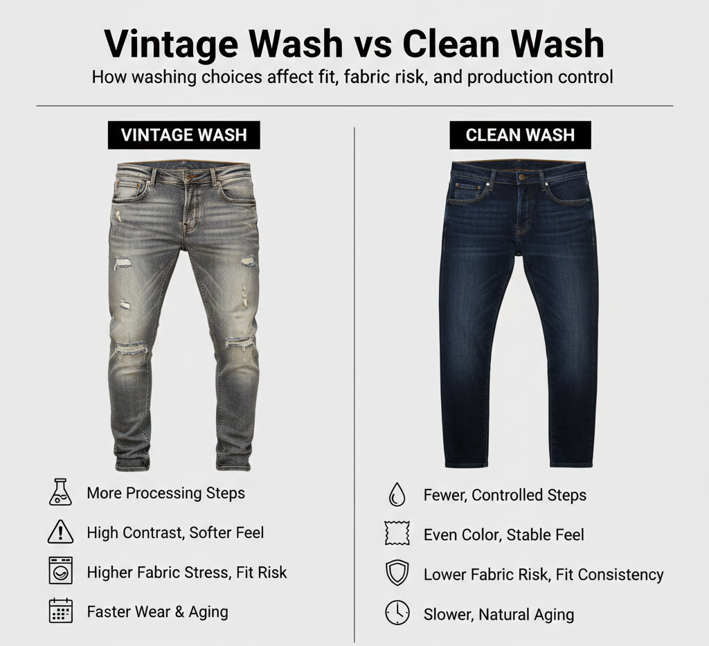 Two of the most common directions — vintage wash and clean wash — lead to very different production paths.